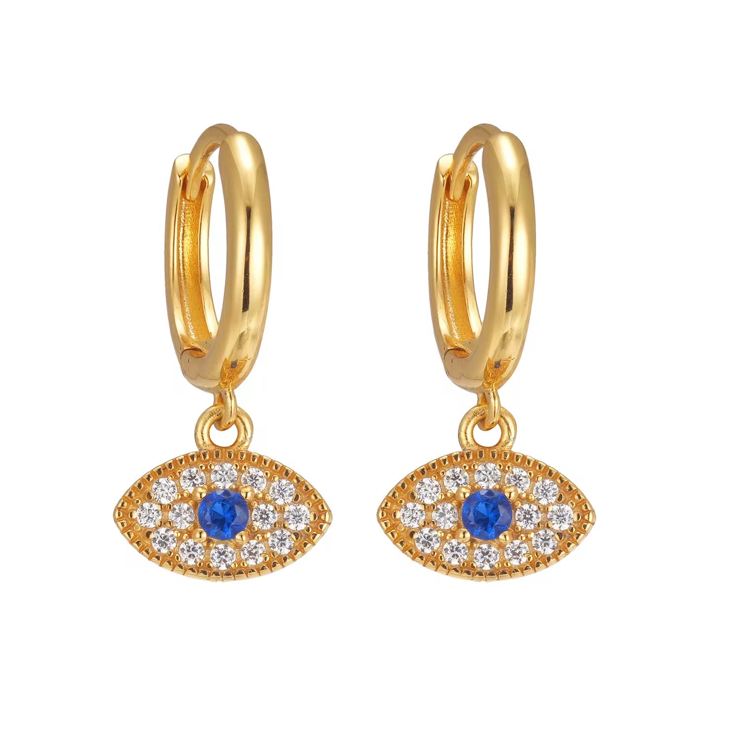 The Elysian Eye Spark Huggies blend celestial charm with everyday elegance, featuring radiant 18k gold-plated silver hoops adorned with a shimmering blue spinel evil-eye dangle and twinkling white zircons.